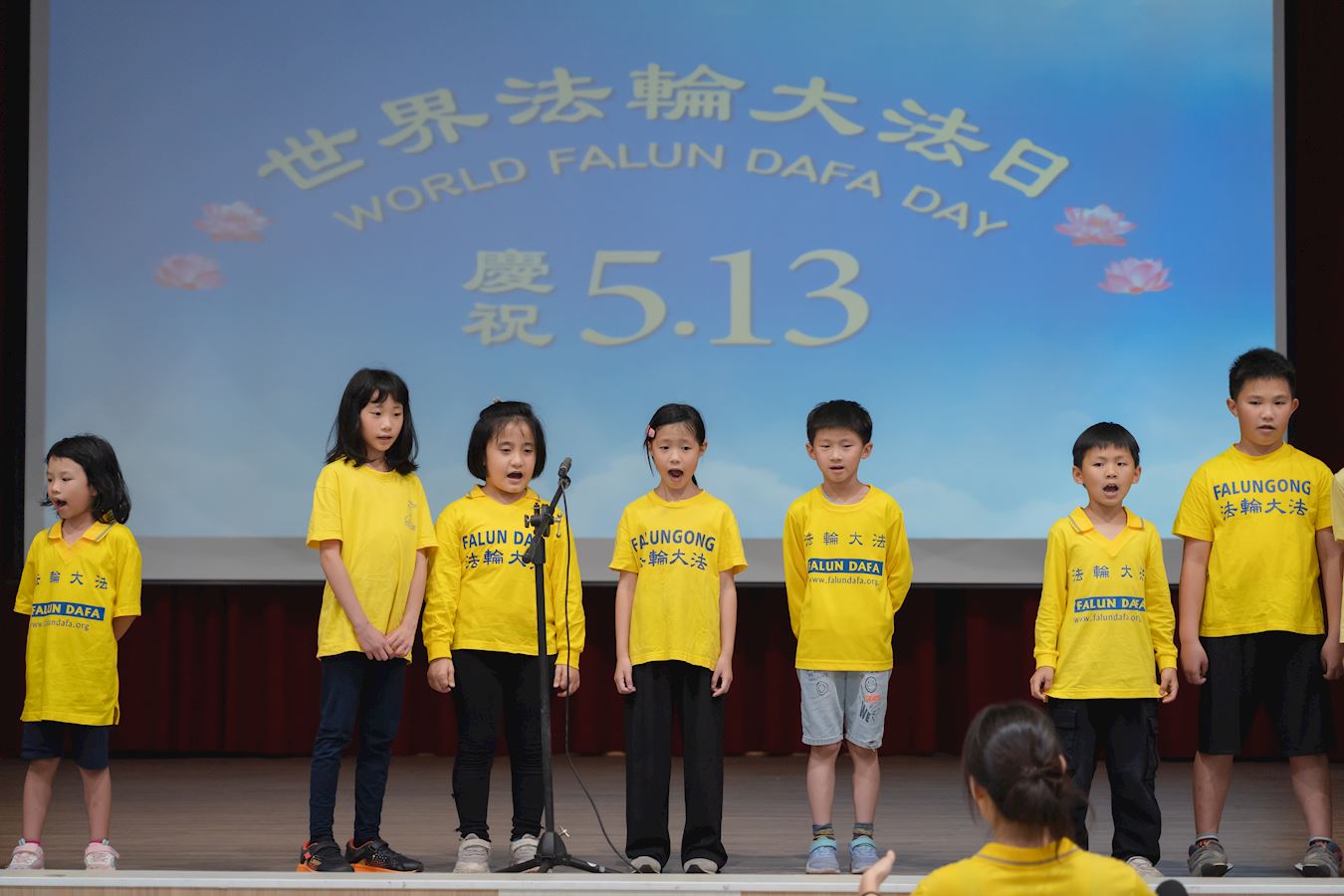Little practitioners recite poems from Hong Yin and sing “Falun Dafa is good.
