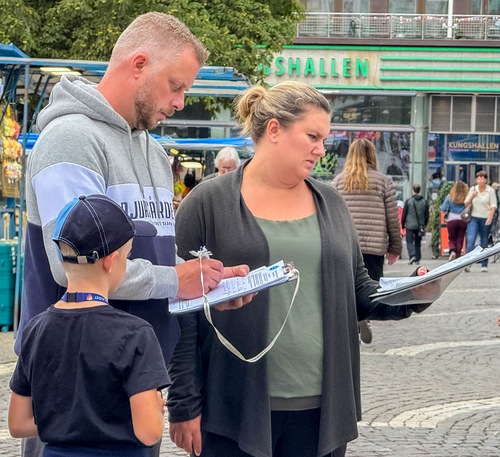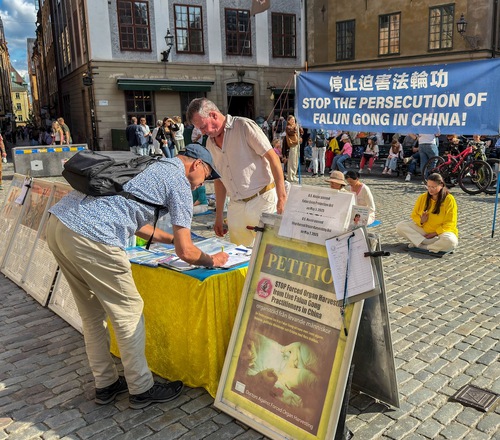 Falun Dafa practitioners clarified the truth to the public beside the Konserthuset Music Hall on the afternoon of September 6, 2025. Many people signed the petition to show their support for practitioners’ efforts to end the persecution.