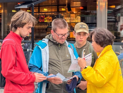 Two young men from China walked past the event venue. Initially, they were unwilling to accept the materials that a practitioner had offered them. It was clear that they had been misled by the CCP’s propaganda against Falun Dafa.