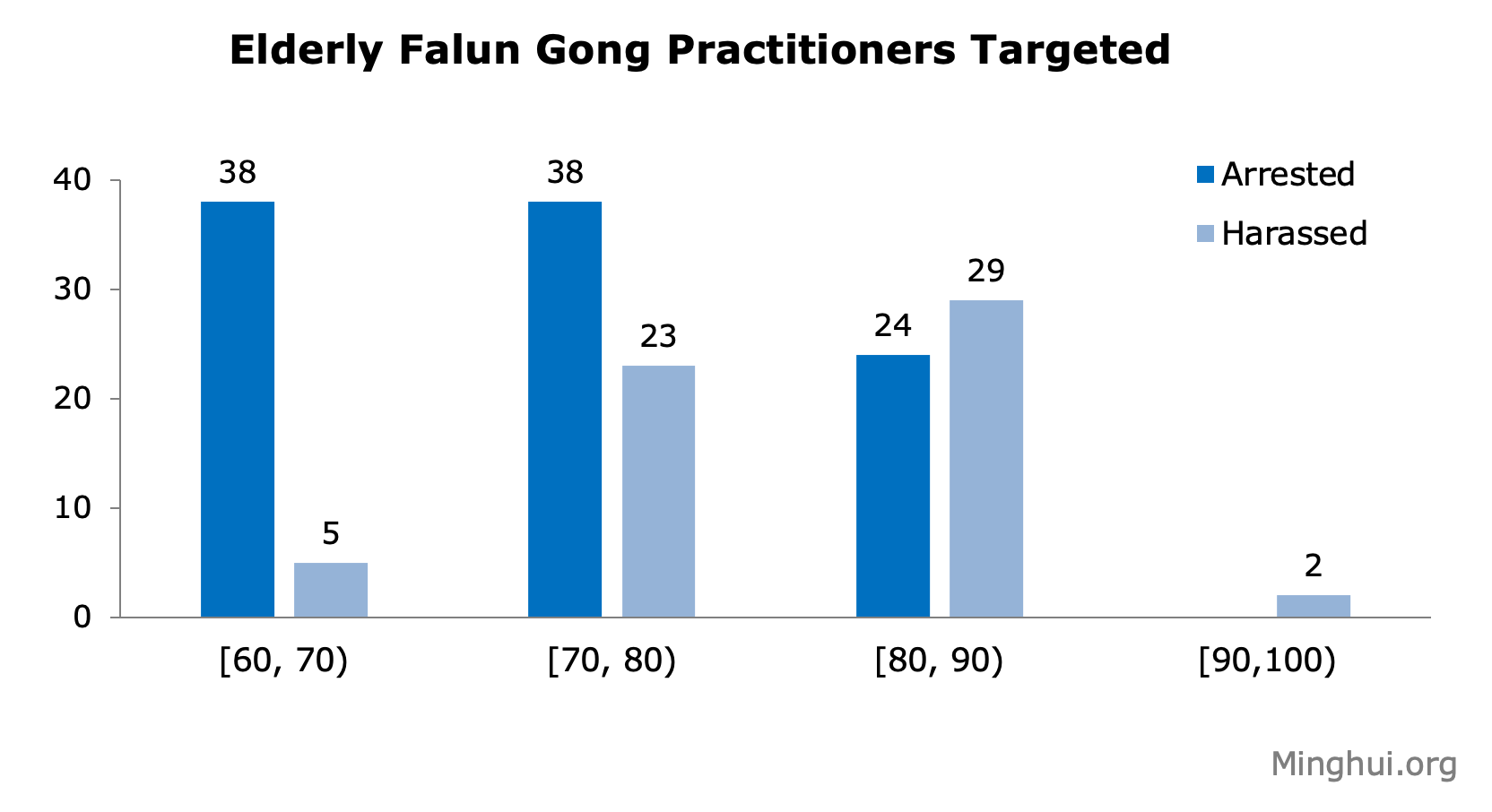 At least 159 practitioners were 60 or older at the time of their arrests or harassment, including 43 in their 60s, 61 in their 70s, 53 in their 80s and two in their 90s. The oldest was a 92-year-old man in Jixi City, Heilongjiang Province, who was harassed along with his 86-year-old wife.