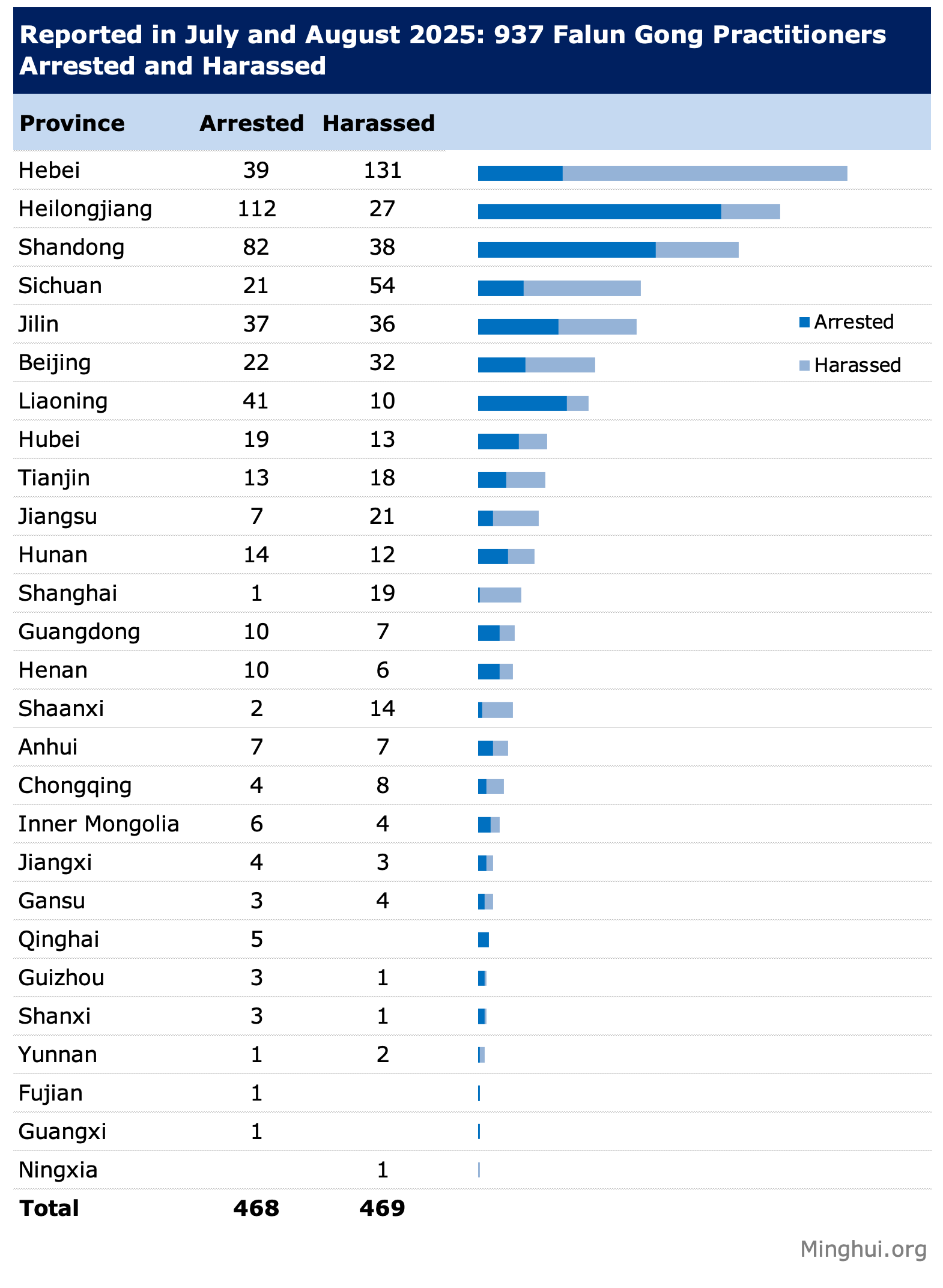 (Minghui.org) A total of 937 incidents of Falun Gong practitioners being arrested or harassed for their faith were reported in July and August 2025.