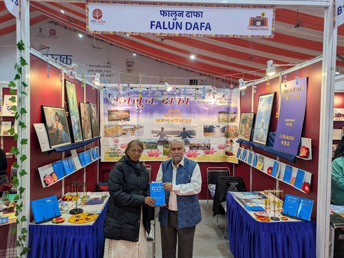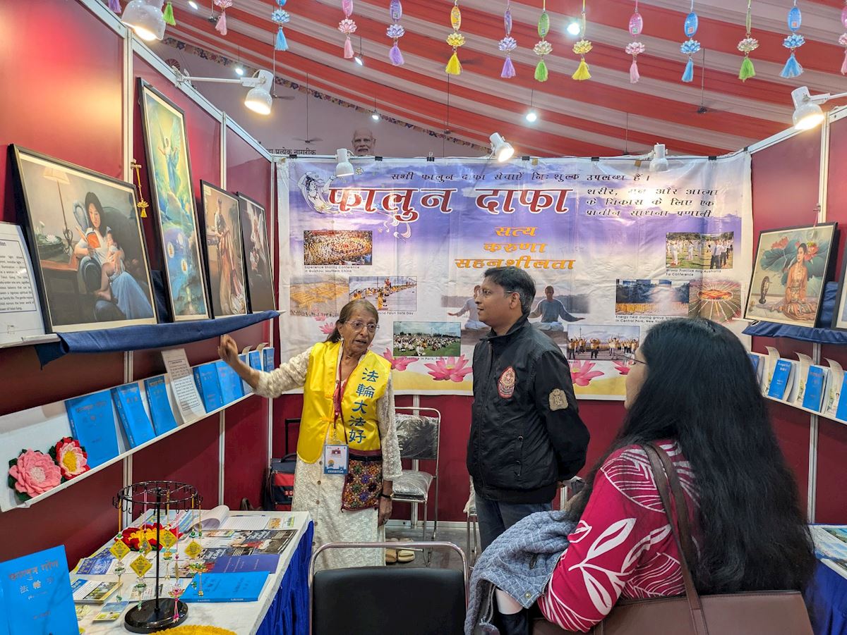 Practitioners displayed Falun Dafa books such as Zhuan Falun and Falun Gong, and some works of art from the Art of Zhen, Shan, Ren International Exhibition. Numerous book lovers and professionals from schools, colleges, the medical community, professional groups, spiritual groups, and political circles, stopped at the Falun Dafa booth to learn more. Many were impressed when they were told that Falun Dafa is taught free of charge by volunteers worldwide. A large number of visitors expressed great interest in the online volunteer-led classes in India and purchased Falun Dafa books in English, Hindi, and Marathi.