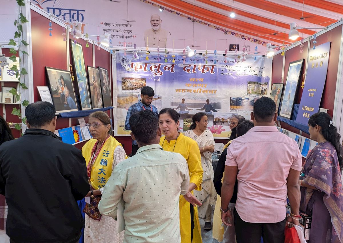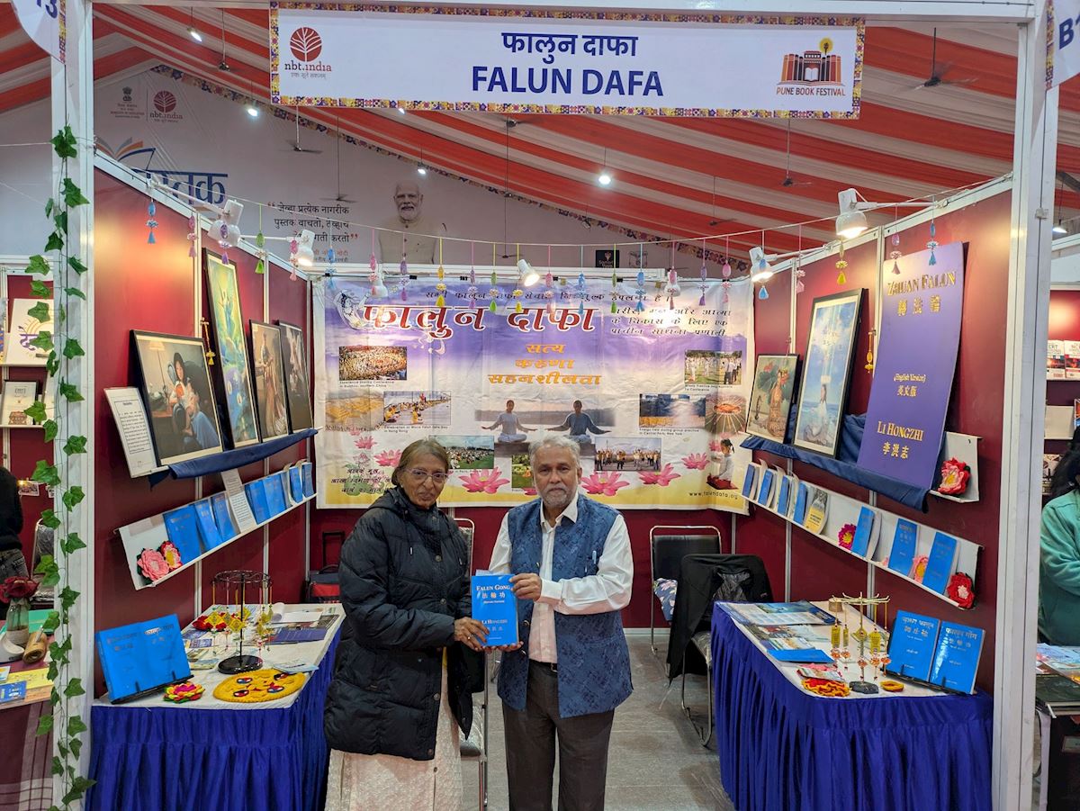 (Minghui.org) Falun Dafa practitioners participated in the nine-day Pune Book Festival at Fergusson College, Pune, Maharashtra from December 13 to 21, 2025, an event organized by National Book Trust, India (NBT), a division under the India Ministry of Education. The book fair attracted over 1.2 million visitors, with young people accounting for over 60% of the attendees. Many prominent figures said they felt the peace and positive energy of Falun Dafa.