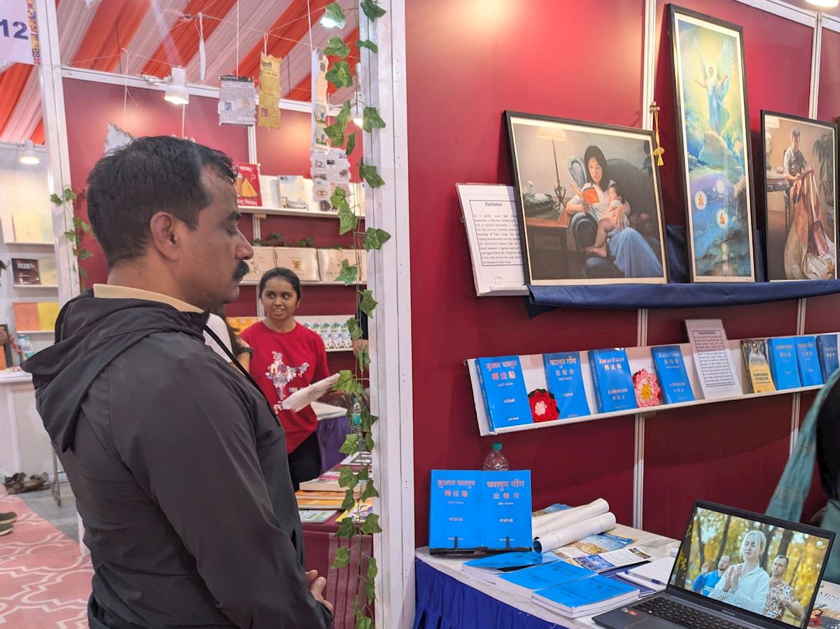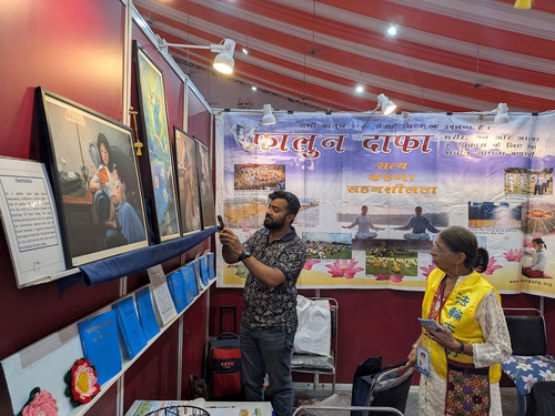 Artist Dr. Gurugovind Ambre, a painter and sculptor, visited the Falun Dafa booth and had a long conversation with practitioners. He said he was very interested in learning more about Falun Dafa and was impressed by the artworks from the Art of Zhen, Shan, Ren International Exhibition. These works, created by Falun Dafa practitioner artists from around the world, aim to showcase the beauty of Falun Dafa and the real-life experiences of practitioners who are persecuted by the Chinese Communist Party (CCP).