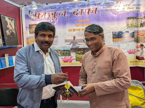 Prof. Milind Marathe, Chairman of National Book Trust, spoke with practitioners at the Falun Dafa booth. He had previously met them at the 2024 book fair. The practitioners presented him with a copy of Falun Gong and expressed their hope that he would add it to the National Book Trust (NBT) library for staff to read. He said he would definitely share the book with all the staff.