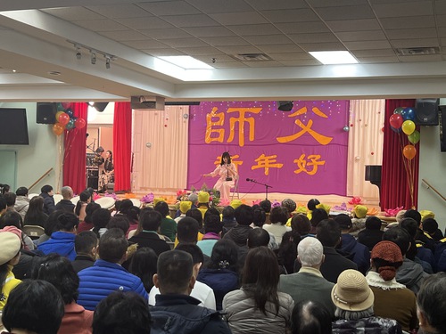 The warm and inviting atmosphere contrasted with the winter cold outside. The stage was decorated with flowers, and colorful lights highlighted a banner that read: “Happy New Year, Master.” The venue was packed with practitioners from different ethnic backgrounds. Ranging in age from 90 to just a few years old, from veteran practitioners to newcomers, they respectfully exclaimed in unison, “We wish Master a Happy New Year! Falun Dafa is good! Truthfulness-Compassion-Forbearance is good!”