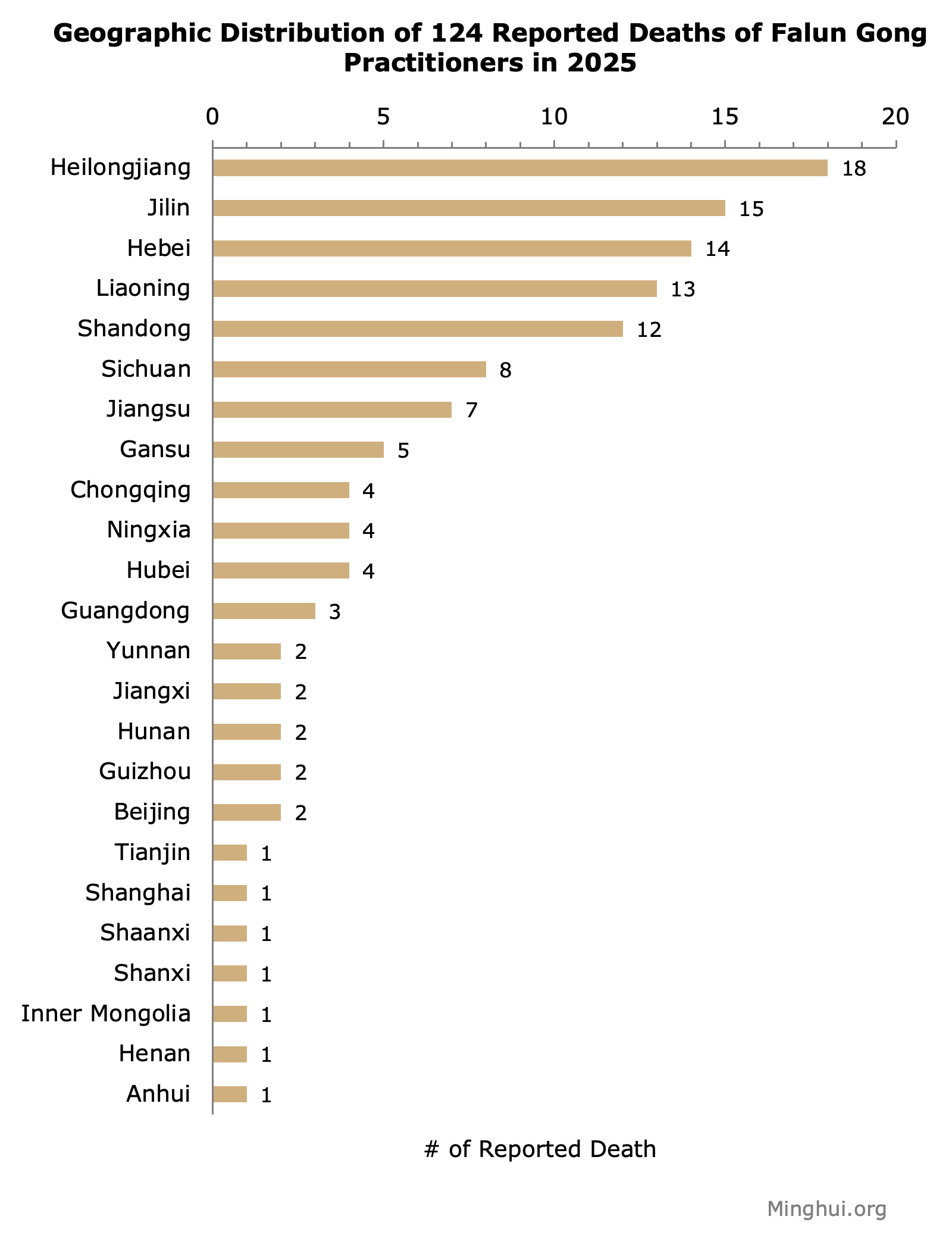 The newly-confirmed 124 deaths included four cases in 2022; six in 2023; 33 in 2024; 62 in 2025; and 19 cases in unknown years. Due to the communist regime’s strict information censorship, the persecution can’t always be reported in a timely manner and the real death toll is likely much higher.
