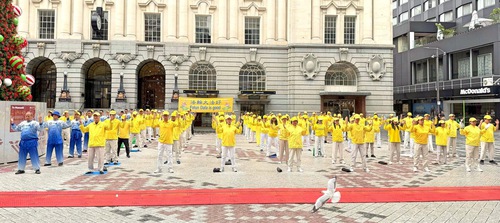 (Minghui.org) Falun Dafa (Falun Gong) practitioners celebrated the arrival of the new year by holding activities in Auckland’s city center, Commercial Bay, on December 27, 2025. They demonstrated the Falun Dafa exercises, and taught them. They also held a rally to inform people about the 26-year persecution in China. Human rights lawyer Kerry Gore addressed the rally, commended the practitioners’ perseverance, and called on people from all walks of life in New Zealand to help practitioners stop the Chinese Communist Party’s (CCP) persecution.