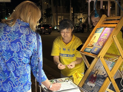 After Qing began practicing Falun Dafa in 2003 she’s become healthy and energetic. She often comes to the booth in Waikiki to clarify the truth to people and hands out flyers. One day she saw a man kneel down in front of the posters when he saw the pictures of the torture and organ harvesting. He kept wiping his tears. Qing was very touched.