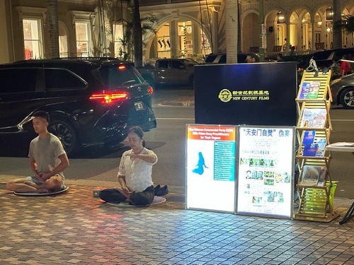 (Minghui.org) The practitioners from a truth-clarification site in Hawaii gathered on Kalakaua Avenue in Waikiki on the evening of December 27, 2025 to wish Master Li a Happy New Year. They expressed their gratitude to Master Li for teaching them the principles of Truthfulness-Compassion-Forbearance and guiding them to walk on a path to return to their true selves. As the New Year is just around the corner, they wished Master Li a Happy New Year and express their immense gratitude to him for his compassionate saving grace. They exclaimed, “We wish Master a Happy New Year! Falun Dafa is good! Truthfulness-Compassion-Forbearance is good!”