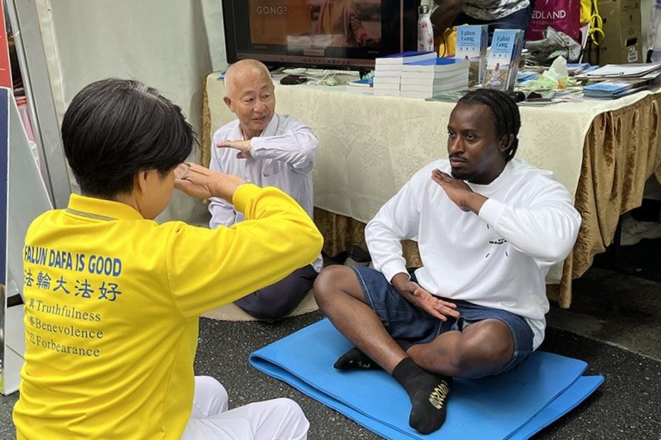 Waswa Kabuye stopped at the booth to learn about Falun Dafa and tried the meditation.