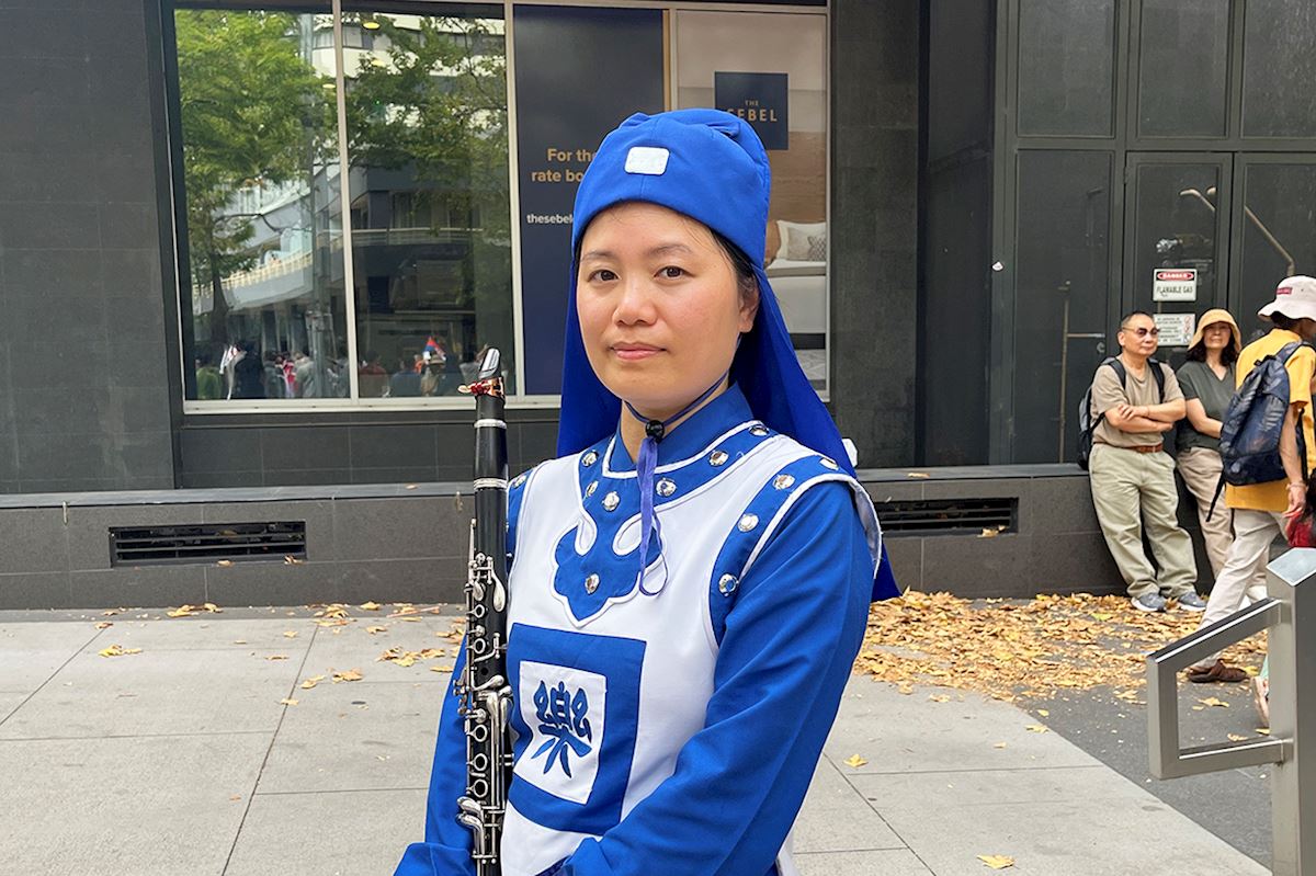 Falun Dafa practitioner Mai Nguyen, who teaches international students English at a college in Sydney, joined the Tian Guo Marching Band eight years ago. She said she was happy to participate in the cultural festival and tell people about Falun Dafa.