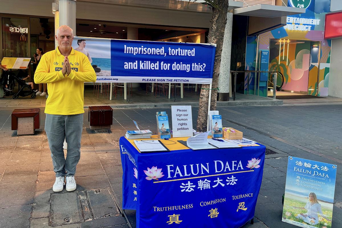 Jason regularly clarifies the truth about the persecution near Surfers Paradise, which is steps away from the coastline and seaside market. Surfers Paradise is a popular destination and attracts both local and international tourists from around the world. Many people stop to read the colorful banners about Falun Dafa and watch as practitioners demonstrate the exercises. They learn about the persecution of Falun Dafa in China and sign petitions to help end the persecution.