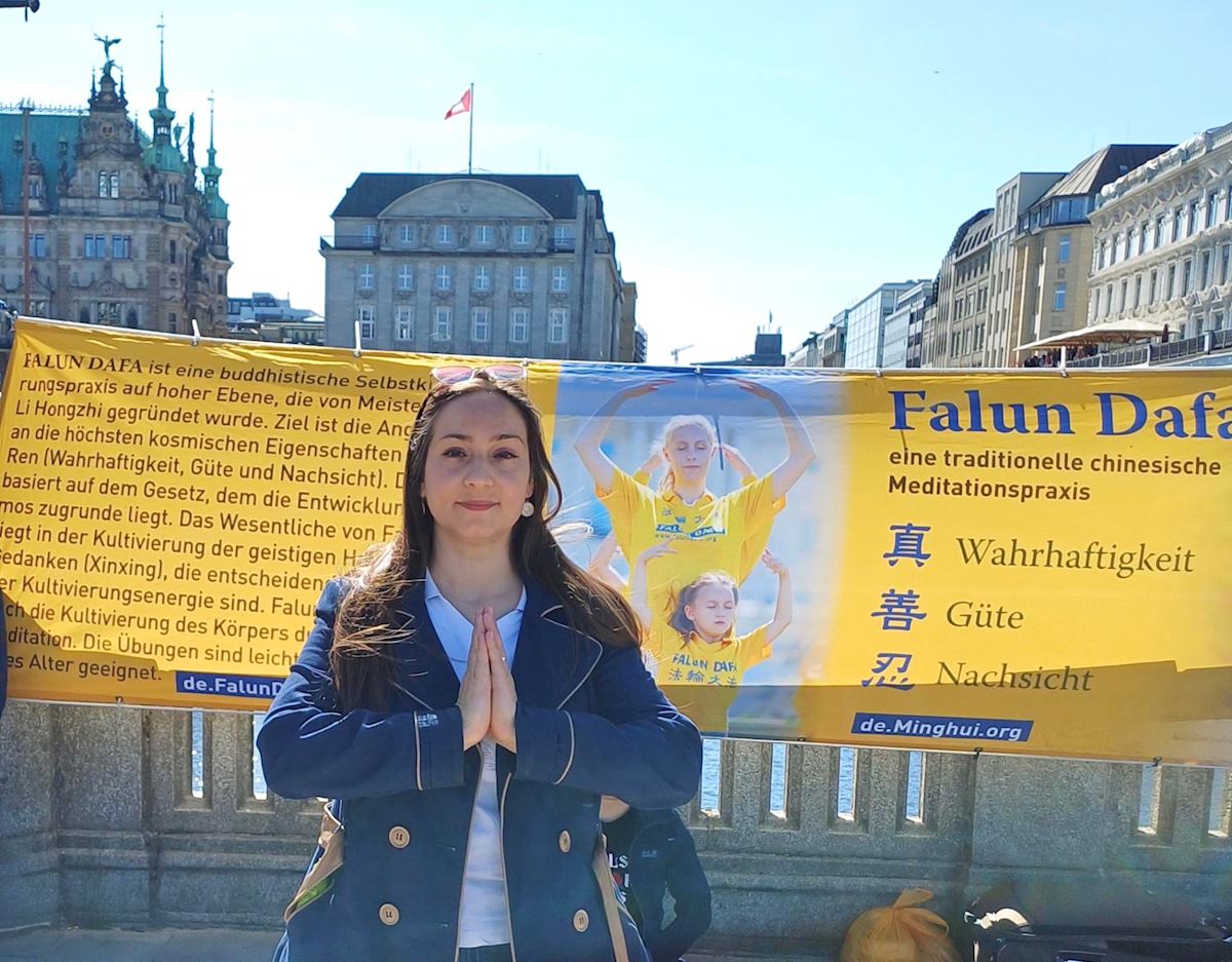 Besides working and taking care of her family, Silvia studies the Fa, clarifies the truth to people online, and participates in other Dafa projects. She also participates in activities to talk to people about Falun Dafa and she distributes flyers to people in Hamburg’s city center. Silvia noted, “Hamburg is a tourist city. People come to listen to the truth every day.”