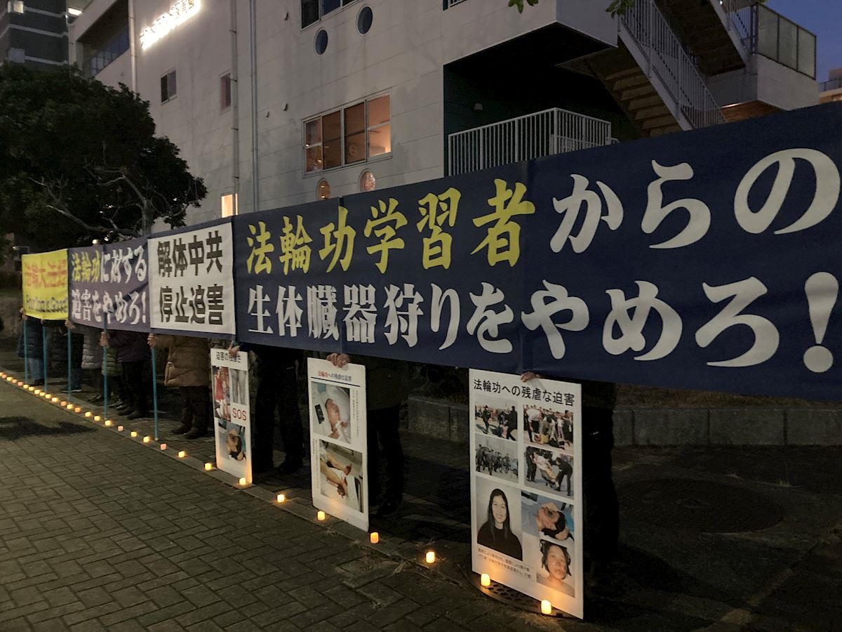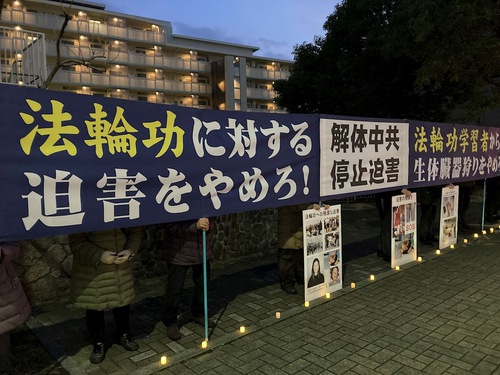 After completing their activities in Sakae, practitioners held a protest in front of the Chinese Consulate General in Nagoya. The displayed banners in Chinese, English, and Japanese. They also held a candlelight vigil to commemorate practitioners in China who died as a result of the CCP’s persecution.