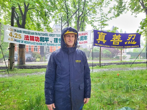 Wilfred participates in an event near the Chinese Embassy in Belgium to clarify the truth about the persecution.