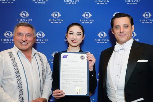 McAllen Mayor Javier Villalobos presented a proclamation to the Shen Yun artists at the McAllen Performing Arts Center in Texas on February 21. (Screenshot courtesy of NTD)