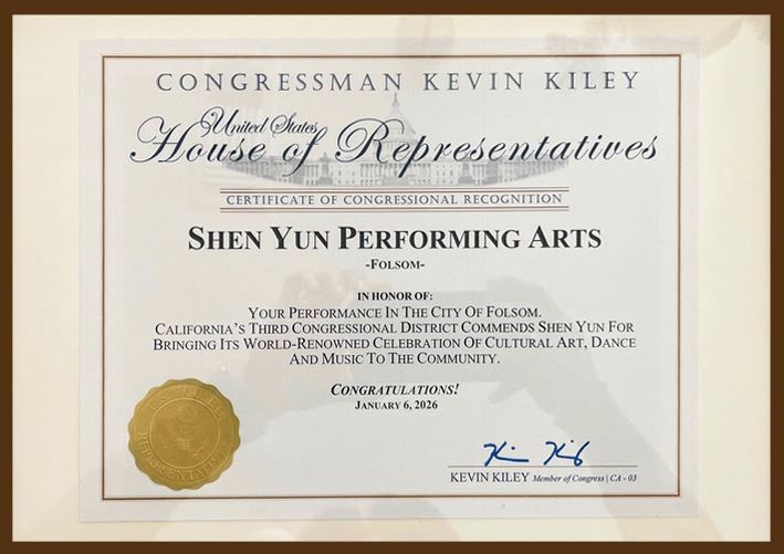 The certificate from Representative Kevin Kiley reads, “California’s third Congressional district commends Shen Yun for bringing its world-renowned celebration of cultural art, dance and music to the community. Congratulations!”