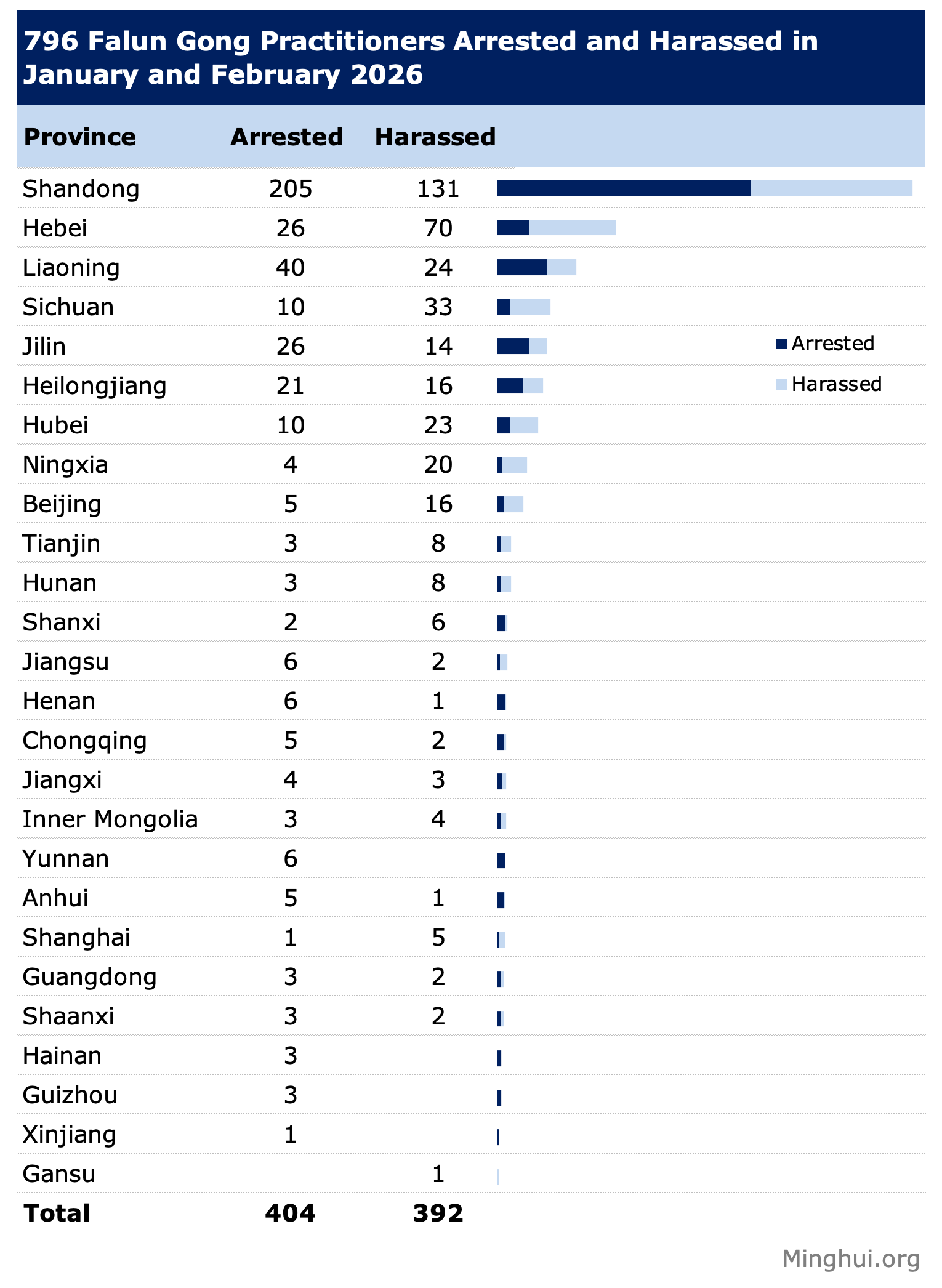(Minghui.org) A total 796 of Falun Gong practitioners were arrested or harassed for their faith in January and February 2026.