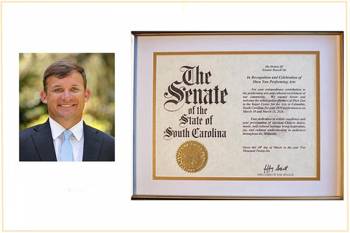 South Carolina Senator Russell Ott warmly welcomed Shen Yun to South Carolina and issued a proclamation, “In recognition and celebration of Shen Yun Performing Arts for your extraordinary contribution to the performing arts and cultural enrichment of our community. We warmly honor and welcome the artists and performers of Shen Yun in the Koger Center for the Arts in Columbia, South Carolina, for your 2026 performances on March 10 and March 11, 2026.