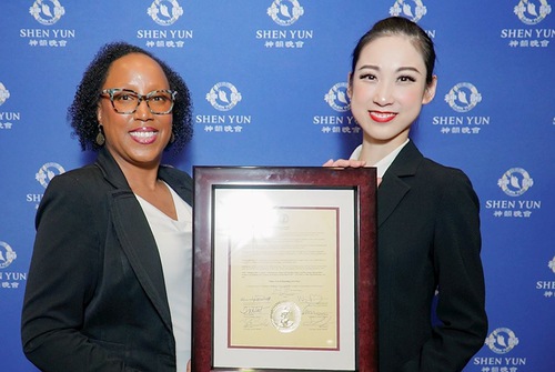 On the evening of March 10, 2026, Chanique Belton (left), chief of staff of the Columbia City Council, presented a certificate of commendation to Shen Yun Performing Arts. (NTD Television)