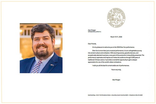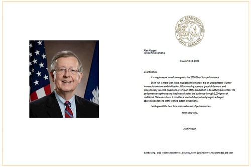 In his congratulatory letter, Governor McMaster wrote, “It is my pleasure to welcome you to the 2026 Shen Yun performance in Columbia, South Carolina.