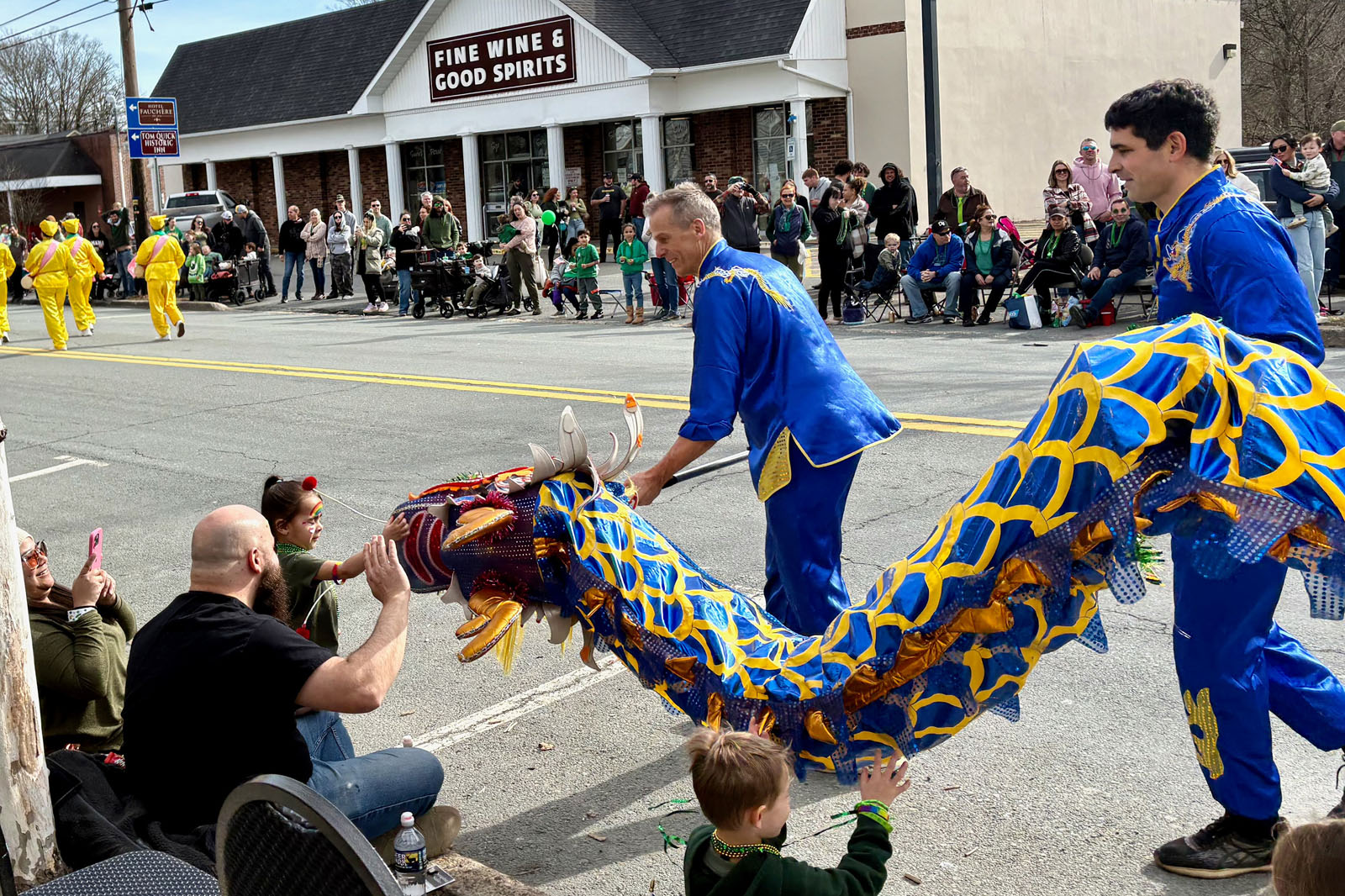 The dragon dance team interacts with spectators.