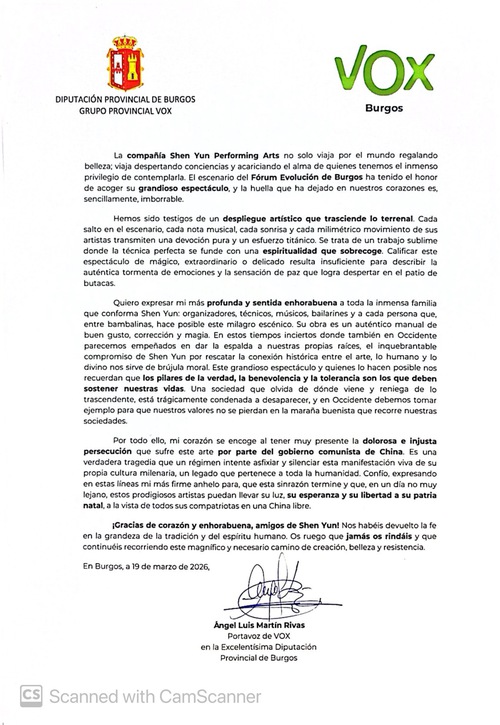 From March 17 to March 19, 2026, Shen Yun Global Company performed three shows in Burgos in northern Spain, all of which were sold out. Members of the Burgos Provincial Council invited Shen Yun artists to visit the provincial council office building on March 19 and presented a proclamation to Shen Yun Performing Arts. They wrote: “We have witnessed an artistic performance that transcends the earthly world.”