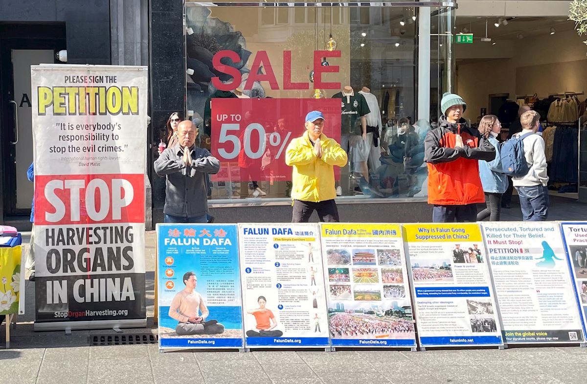 Dublin’s city center is a major draw for tourists. Every weekend in February and March, Falun Gong practitioners held activities there to introduce the practice and expose the ongoing persecution in China. Via flyers, poster displays, and collecting signatures on a petition, they expose the Chinese Communist Party’s (CCP) brutal persecution of Falun Gong practitioners including the regime’s forced organ harvesting of prisoners of conscience. Many people stop to watch the Falun Gong exercise demonstrations and sign the petition that calls for an end to the persecution.
