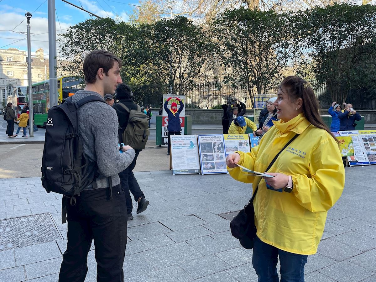 (Minghui.org) “They emit good energy. I feel a strong energy around these people,” Andrzej, a tourist visiting Ireland, said while he watched practitioners quietly do the exercises in Dublin, Ireland’s capital city, on March 21, 2026.