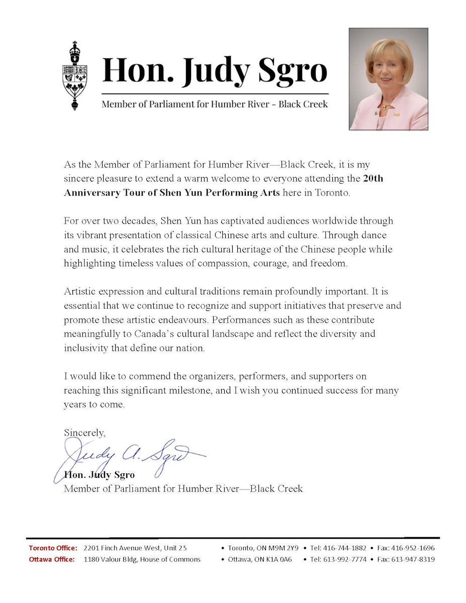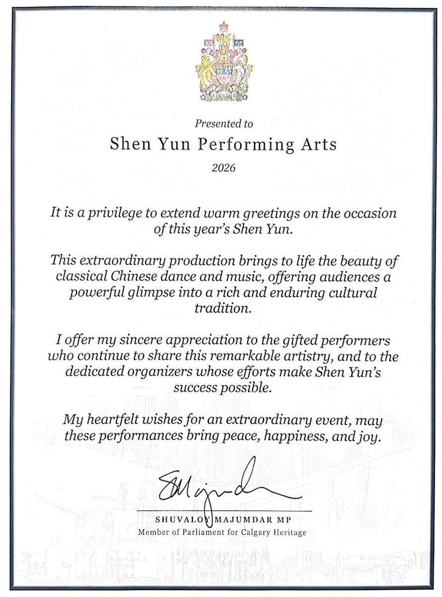 “Through music and dance, Shen Yun brings to life enduring values such as truthfulness, compassion, and forbearance—principles that resonate deeply with Canadians and reflect the foundations of our free and democratic society.”
