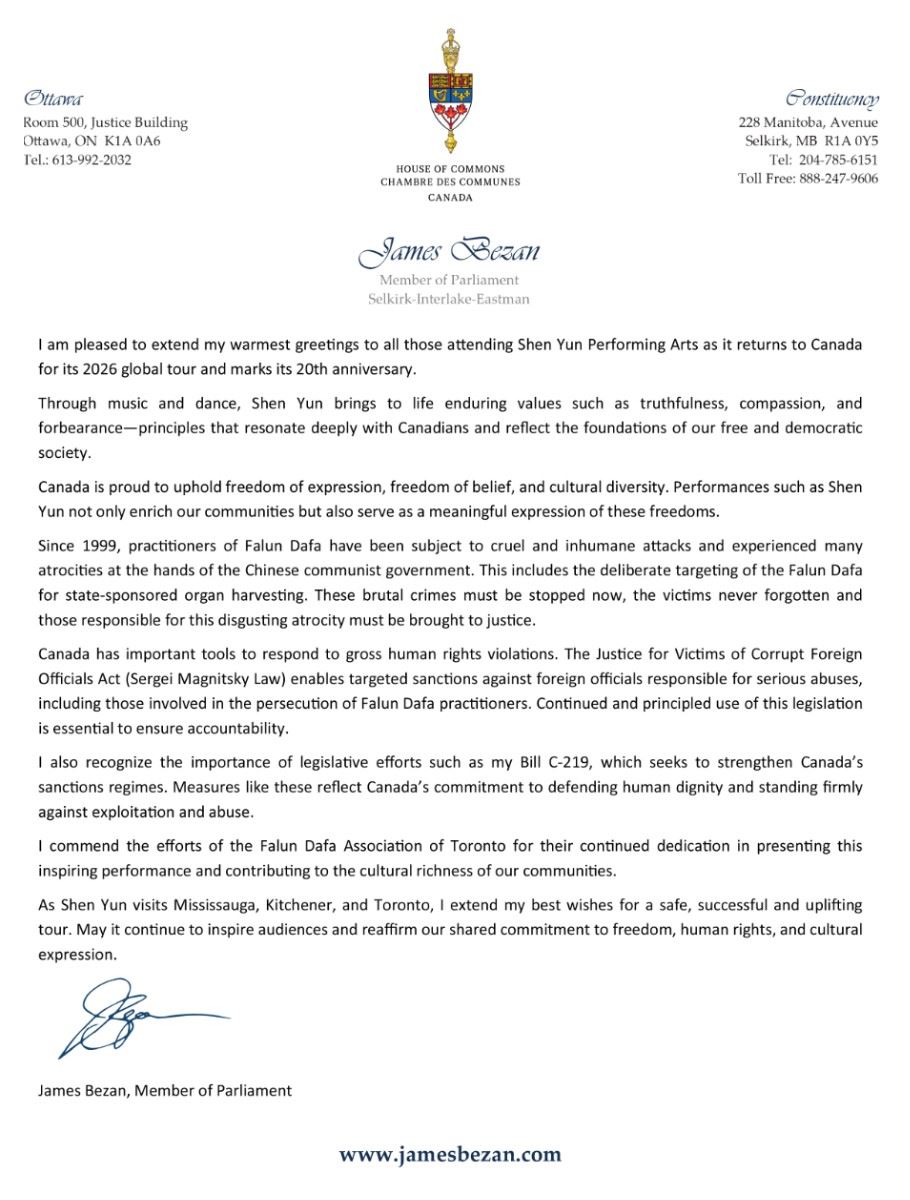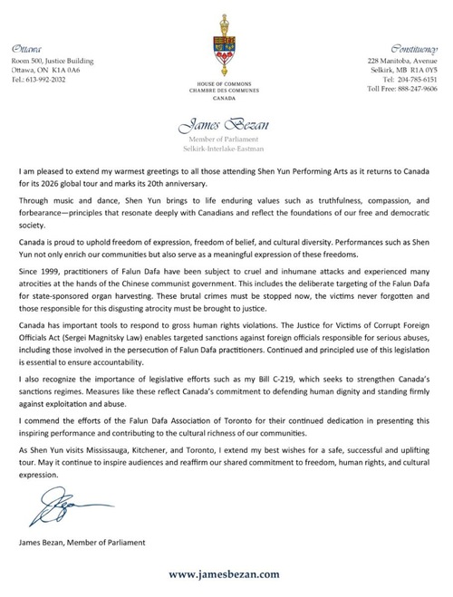 James Bezan MP for Manitoba wrote, “I am pleased to extend my warmest greetings to all those attending Shen Yun Performing Arts as it returns to Canada for its 2026 global tour and marks its 20th anniversary.