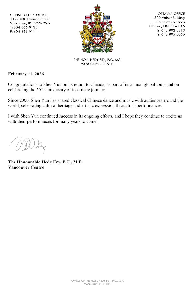 Hedy Fry MP for Vancouver Centre wrote, “Congratulations to Shen Yun on its return to Canada, as part of its annual global tours and on celebrating the 20th anniversary of its artistic journey.