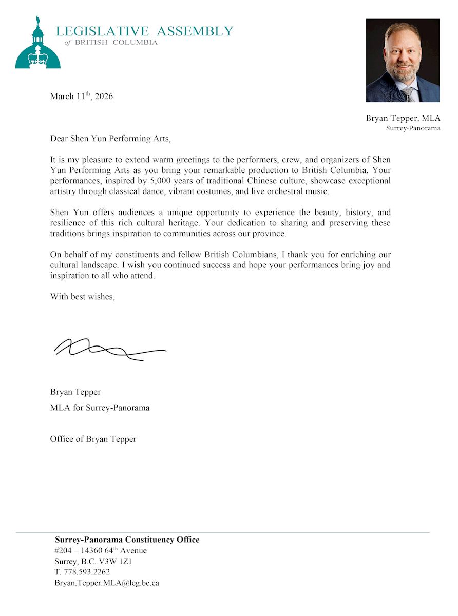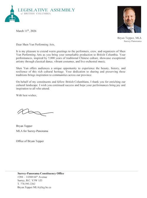 Bryan Tepper MLA of British Columbia wrote, “It is my pleasure to extend warm greetings to the performers, crew, and organizers of Shen Yun Performing Arts as you bring your remarkable production to British Columbia. Your performances, inspired by 5,000 years of traditional Chinese culture, showcase exceptional artistry through classical dance, vibrant costumes, and live orchestral music.