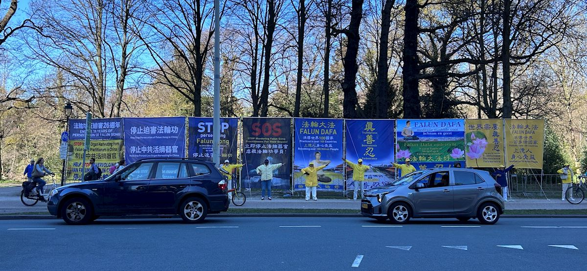 Practitioners displayed banners beside the temporary location of the House of Representatives—along the south side of Prinses Irenepad and the north side of the Bezuidenhoutseweg. The banners read: “Stop the Persecution of Falun Gong,” “26 Years of Falun Gong’s Resistance to Persecution,” “Stop Organ Harvesting and Murder of Falun Gong Practitioners,” “Falun Dafa Has Spread to Over 100 Countries, Benefiting the Minds and Bodies of Hundreds of Millions,” and “The World Needs Truthfulness-Compassion-Forbearance.”