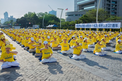 (Minghui.org) Practitioners gathered at the Taipei City Hall Plaza on April 19 to commemorate the April 25th appeal in Beijing 27 years ago and to tell people about Falun Gong. After practitioners were detained in the nearby city of Tianjin in April 1999, about 10,000 practitioners went to the State Petition Office in Beijing to peacefully request they be released. The Chinese Communist Party (CCP) launched a nationwide suppression three months later, in July 1999.
