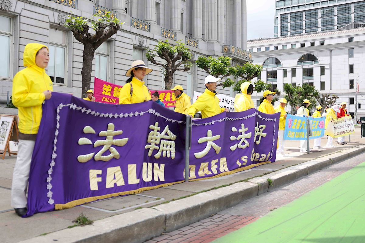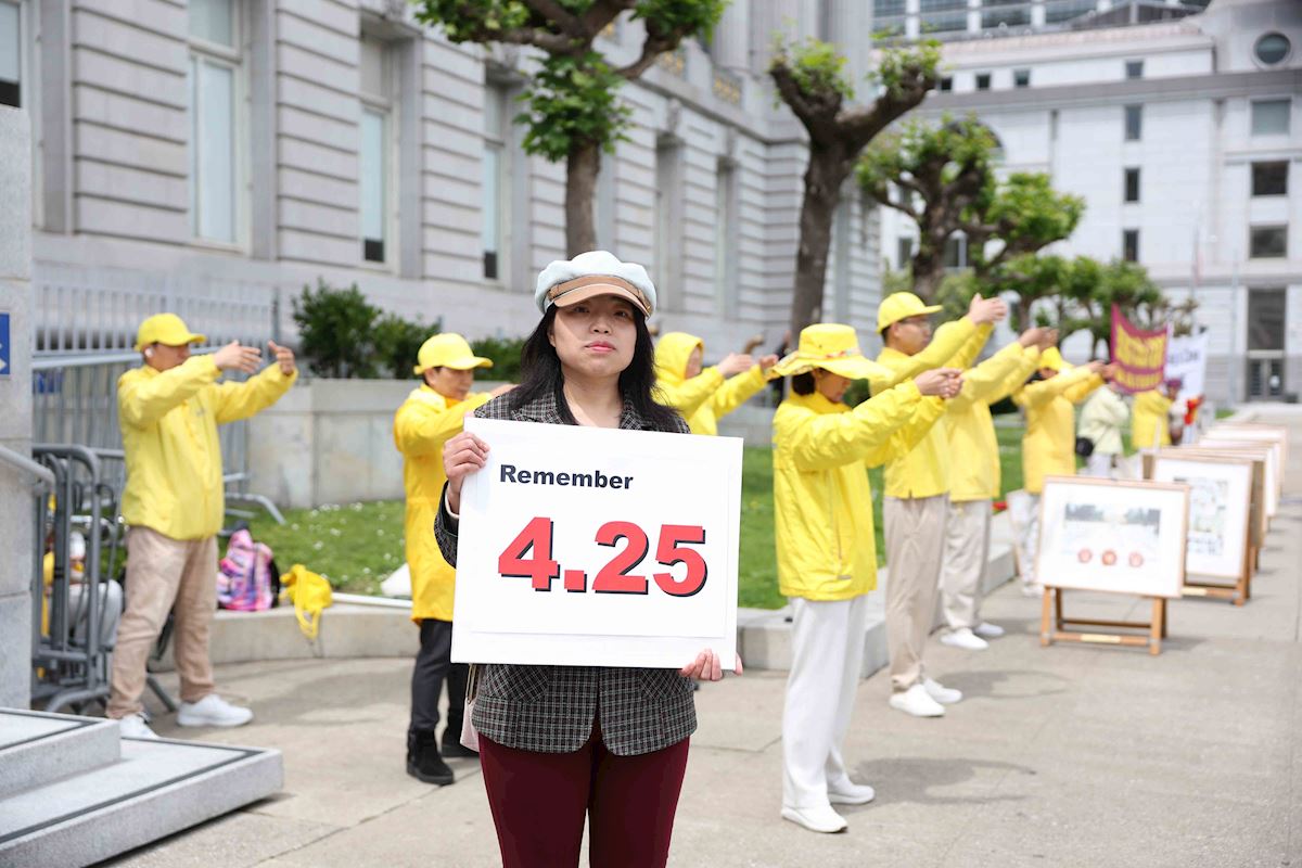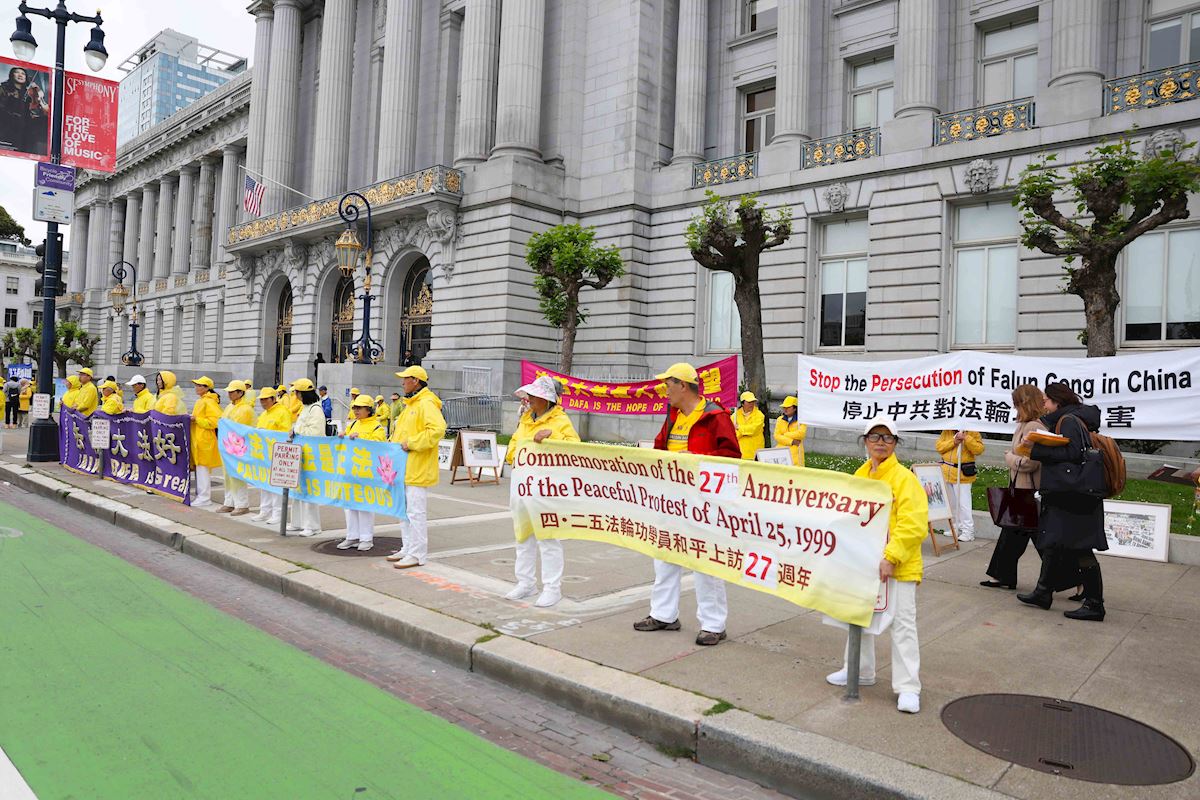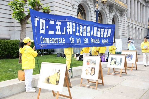 (Minghui.org) Falun Gong practitioners held a photo exhibit outside the San Francisco City Hall on April 21, 2026, to commemorate their peaceful appeal in Beijing on April 25, 1999.