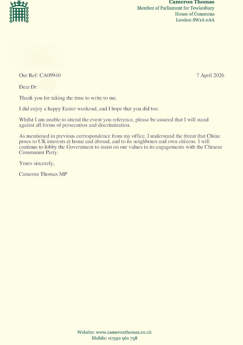 “Please be assured that I will stand against all forms of persecution and discrimination,” Cameron Thomas MP wrote. “As mentioned in previous correspondence from my office, I understand the threat that China poses to UK interests at home and abroad, and to its neighbours and own citizens. I will continue to lobby the Government to insist on our values in its engagements with the Chinese Communist Party.”