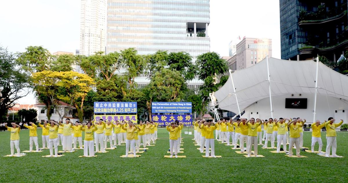 Practitioners perform the Falun Gong exercises at Hong Lim Park to mark the 27th anniversary of the April 25 appeal in Beijing on April 16.
