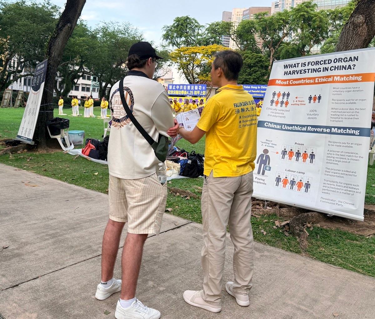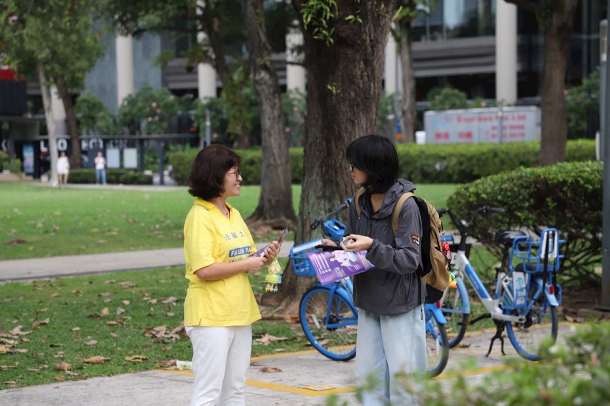 A young man from China who was visiting Singapore said he felt the atmosphere of freedom there, and listened carefully to the practitioner’s explanation. The practitioner told him that the CCP’s suppression of Falun Dafa practitioners is also a persecution of all Chinese people, and that suppressing kindness leads to moral decline and the breakdown of the law. As such, everyone bears the consequences. The young man told the practitioner, “I understand everything you said.”
