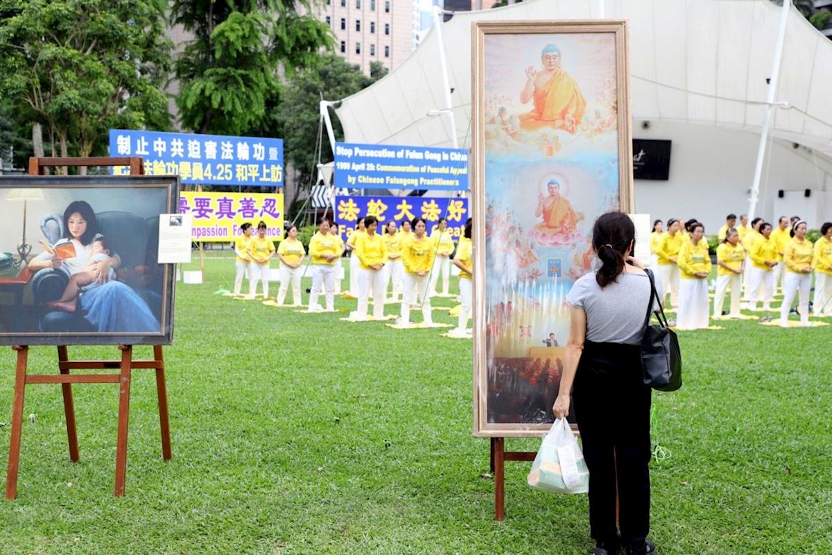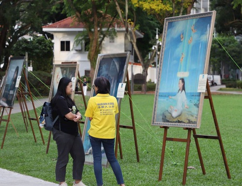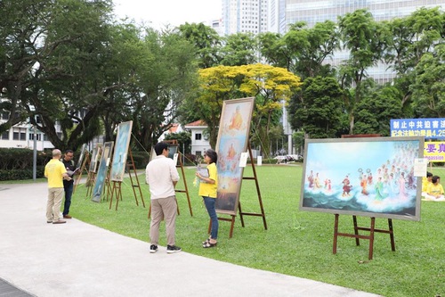 People stopped to view paintings from the Art of Zhen Shan Ren Exhibition, which was on display as part of the event. They talked with practitioners, reflected on the meanings behind the artworks and learned about the CCP’s persecution of belief. Some said that the paintings emitted a kind of energy, while others said they felt distressed to hear about the persecution. Jeremy, a Singaporean in his thirties, showed great interest in the painting Teaching the Fa. A practitioner told him about Falun Dafa, and invited him to attend a free nine-day class. She also told him that the Falun Dafa Association in Singapore is a legally registered organization, and told him about the brutal persecution in China.