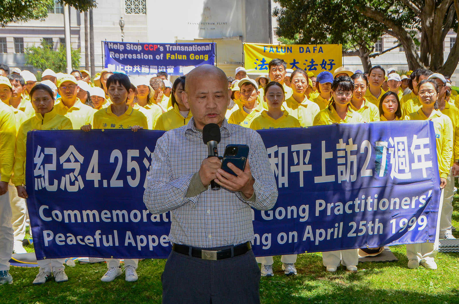 Professor Wu Yingnian, spokesperson for the Los Angeles Falun Dafa Association, briefly introduced the background of the April 25 appeal in Beijing. He said that practitioners went to Beijing to request the release of more than 40 practitioners who were arrested in Tianjian, a city 60 miles east of Beijing.