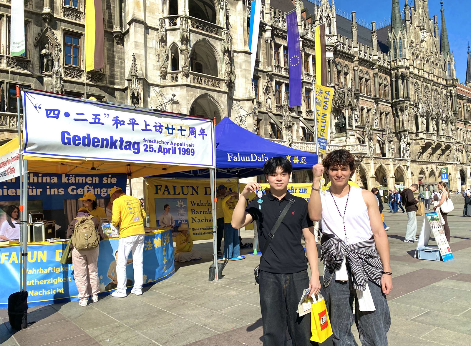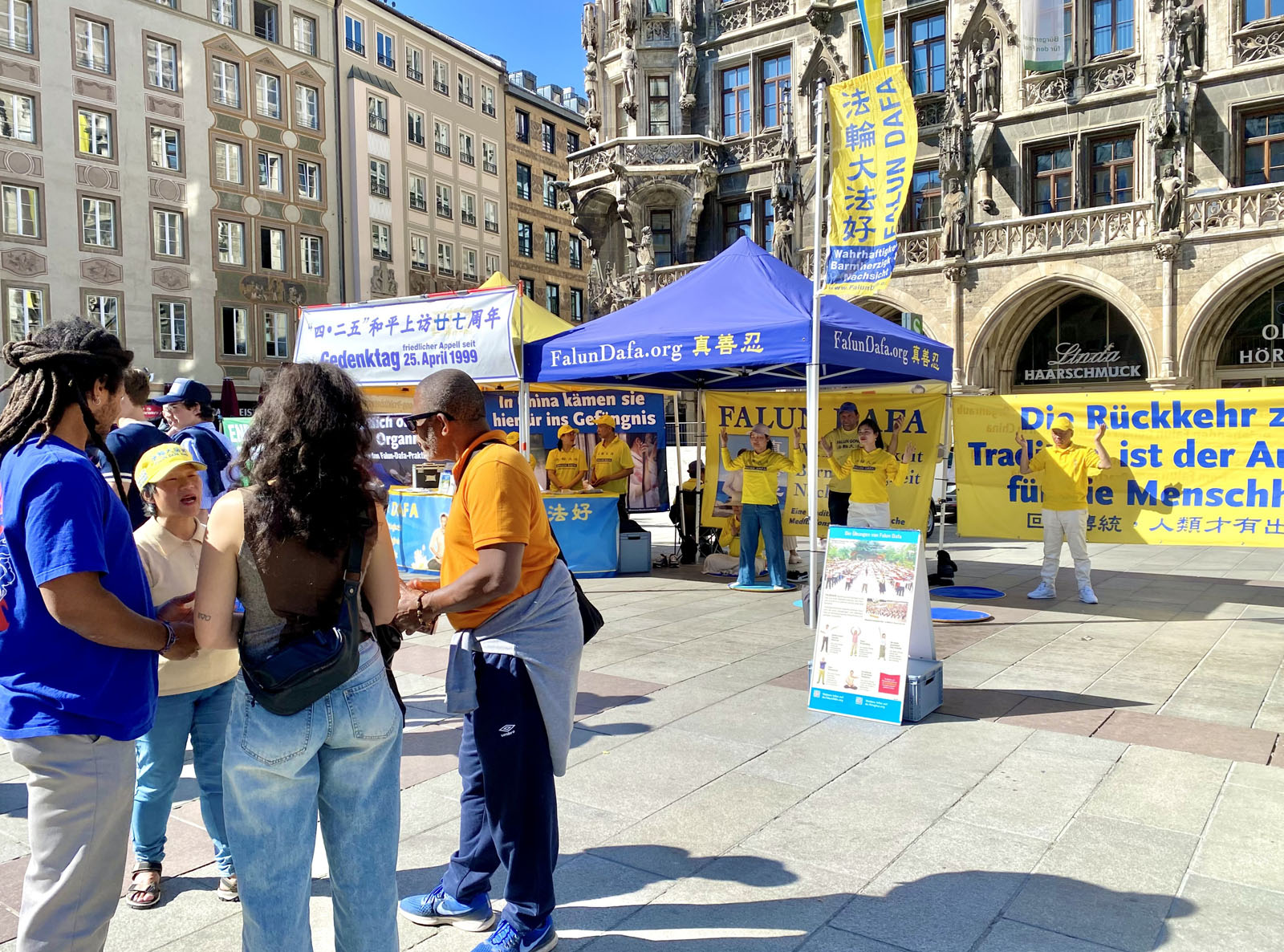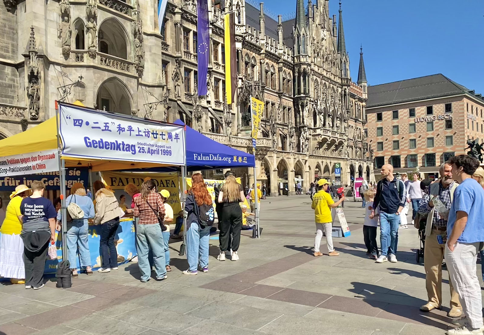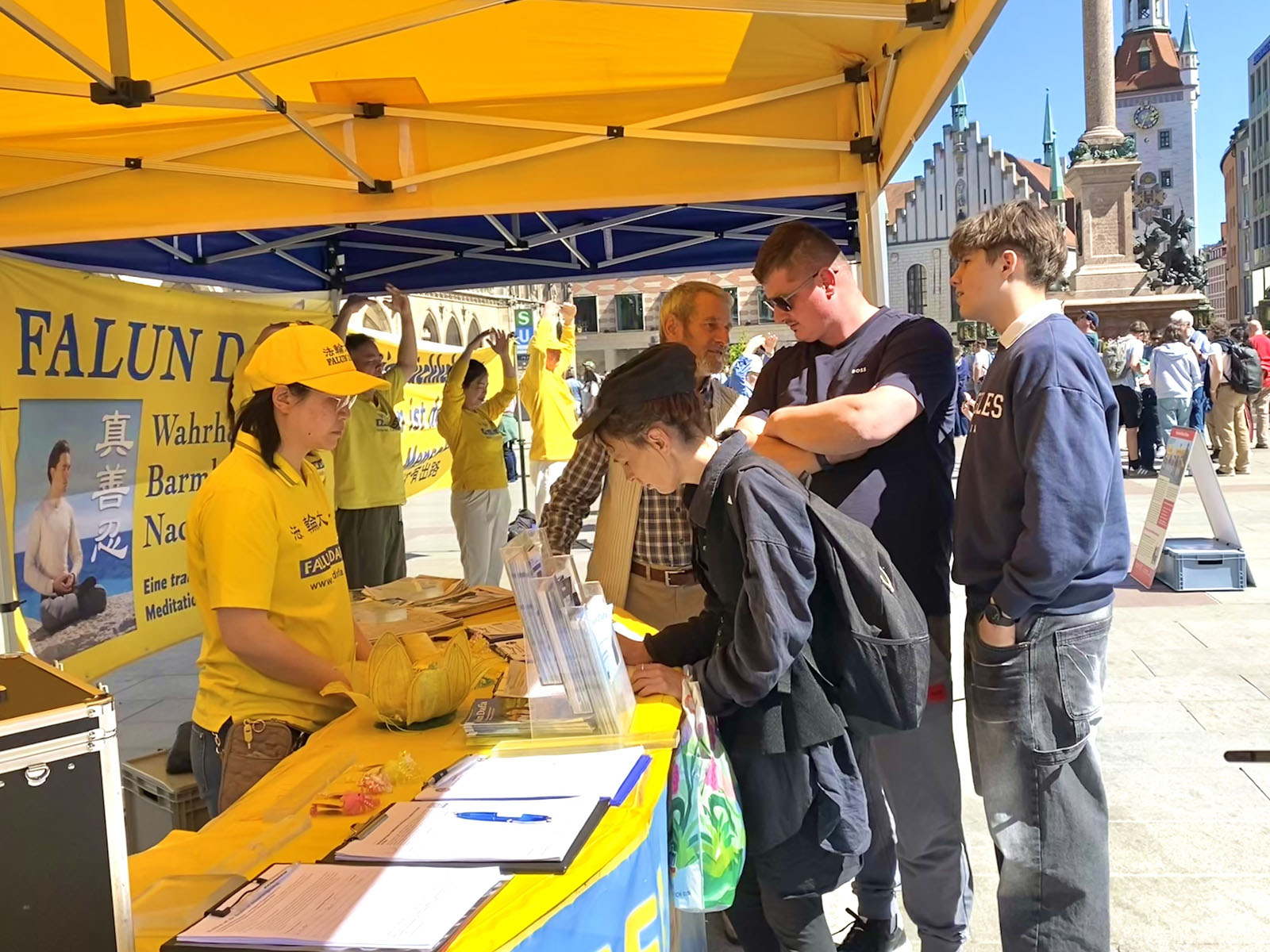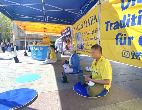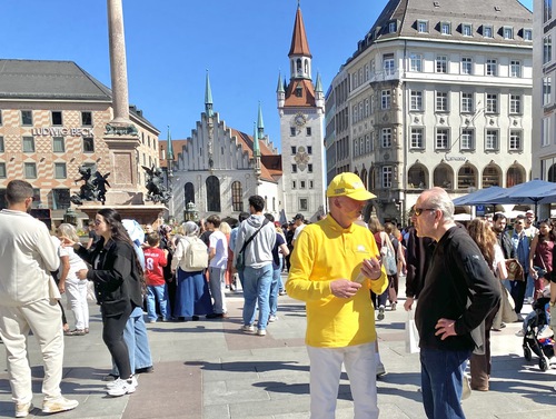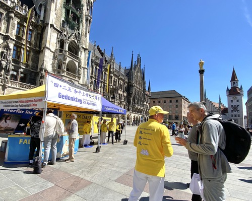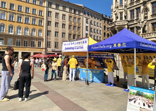 (Minghui.org) Falun Dafa practitioners held an event in Munich, Germany’s third-largest city, on April 25, 2026 to commemorate the peaceful appeal in Beijing 27 years ago. Passersby praised the event, and some Chinese students and tourists agreed to sever ties with the Chinese Communist Party (CCP) after they heard how the regime mistreats practitioners.