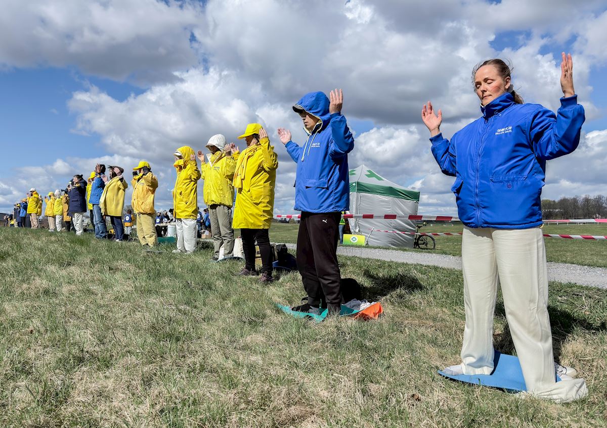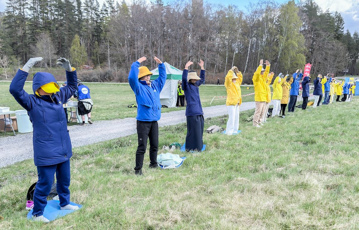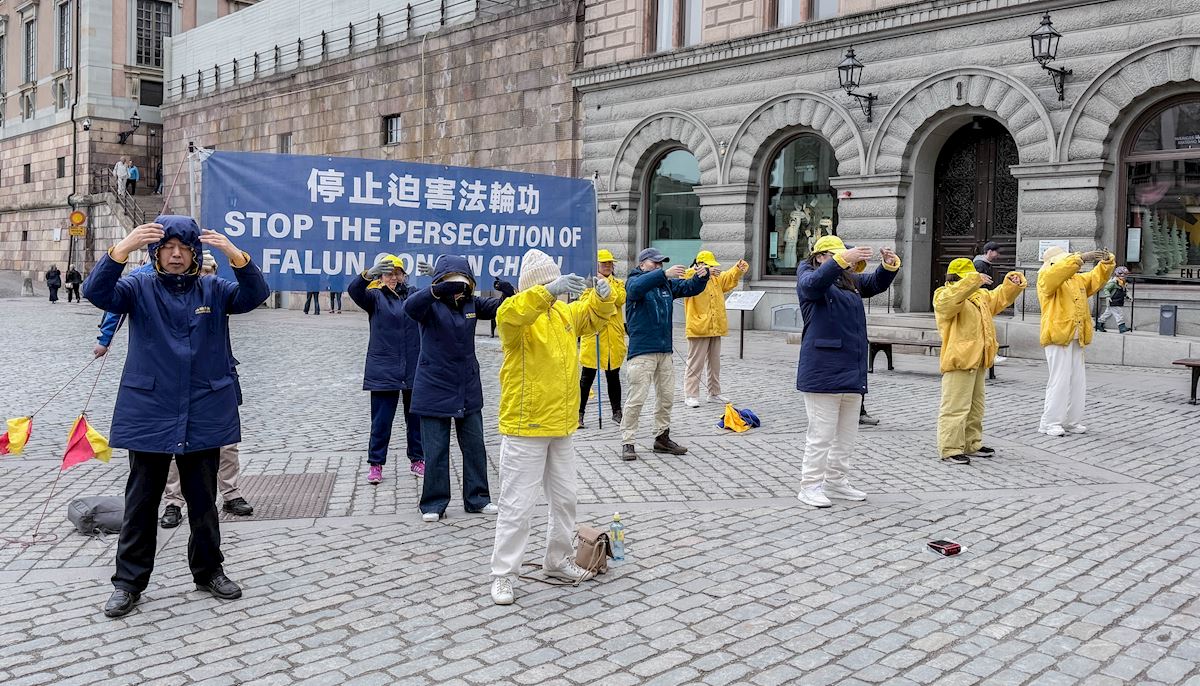 Practitioners do the exercises in front of the Chinese Embassy in Stockholm on April 25, 2026.