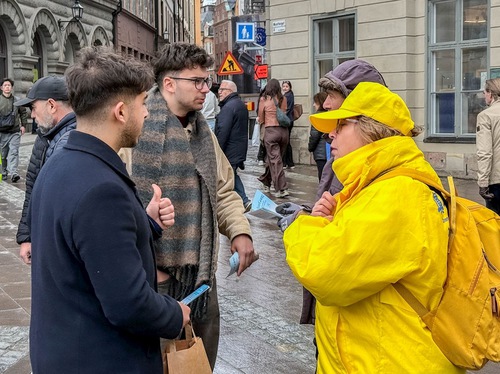 (Minghui.org) As a woman walked along the lawn across from the Chinese Embassy in Stockholm, a Falun Dafa practitioner handed her a flyer. The woman accepted it and said she had heard about China’s human rights abuses, but she felt many things were not reported by the media.