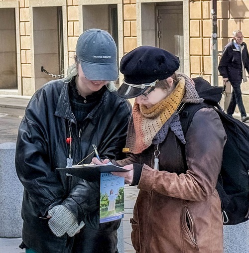 The practitioner was handing out materials during a rally in front of the embassy to mark the 27th anniversary of the April 25 appeal in Beijing. More than 10,000 practitioners went to the State Appeals Office on April 25, 1999, to ask that they be allowed to exercise their constitutional right to practice Falun Dafa. The CCP later claimed practitioners were “besieging the CCP headquarters” and launched a brutal persecution, which continues today.